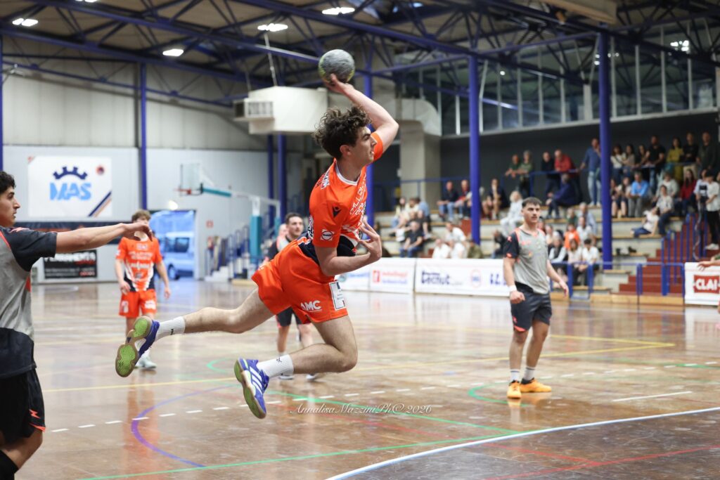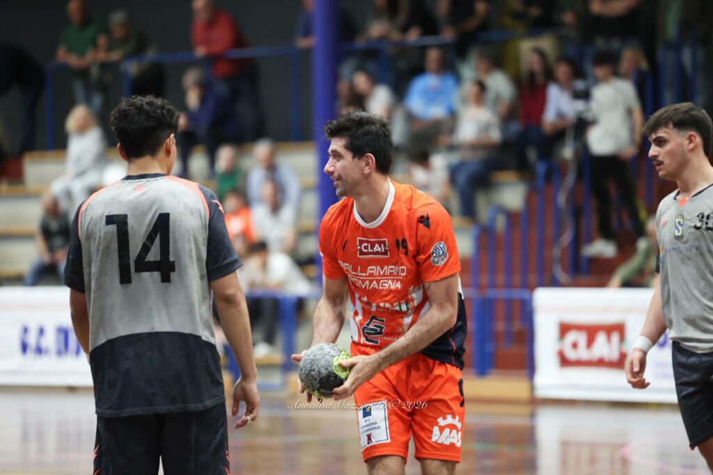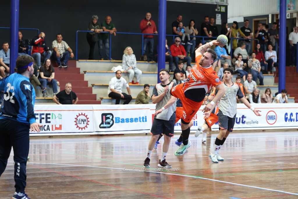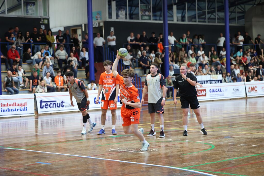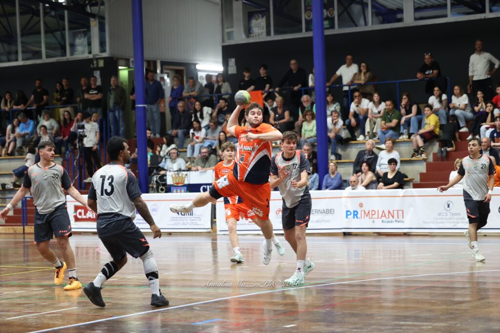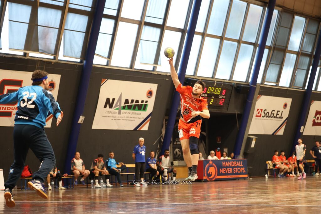 La gara racconta di un netto e prevedibile predominio dei locali che scappano subito sul 7-1 al 9’ grazie alla tripletta di Mengoli; quindi si registra una piccola reazione dei campani che tornano sotto sul 10-6 e sul 14-11 attorno al 20’ con le reti di Bennardo, mentre tra i locali tripletta anche per Parmeggiani che vola in contropiede e all’ala destra. Al 25’ il primo gol in serie A della giovane promessa della pallamano mordanese Leonardo Ceroni, classe 2008, che realizza il rigore (da lui stesso provocato) del 15-11.