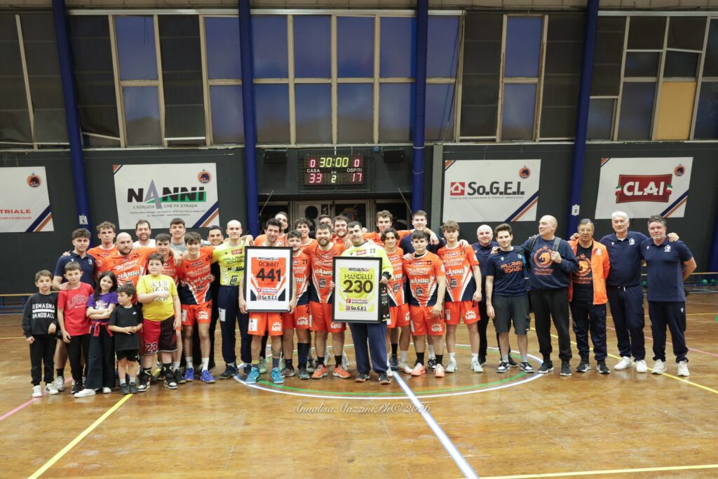 A fine gara, lacrime vere per le emozioni, soprattutto per capitan Rinaldo Ronni Ceroni e per il portiere Samuele Mandelli a cui il PalaCavina ha tributato una vera e propria standing ovation: game over per la carriera di entrambi, dopo oltre vent’anni di pallamano giocata a tanti livelli, soprattutto in serie A.